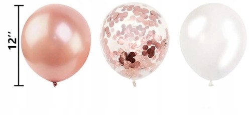 Balony lateksowe rozm. 32 cm metaliczne białe, różowe złoto i transparentne z konfetti różowo złotym.