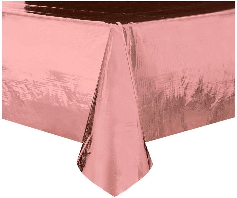 Obrus foliowy metaliczny w kolorze różowego złota o wym. 137 x 183 cm.