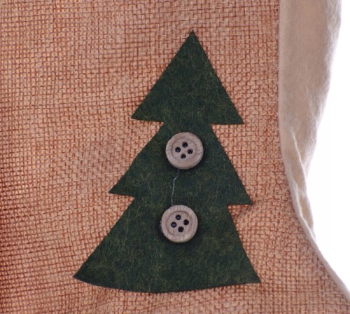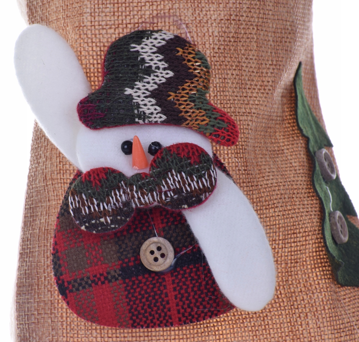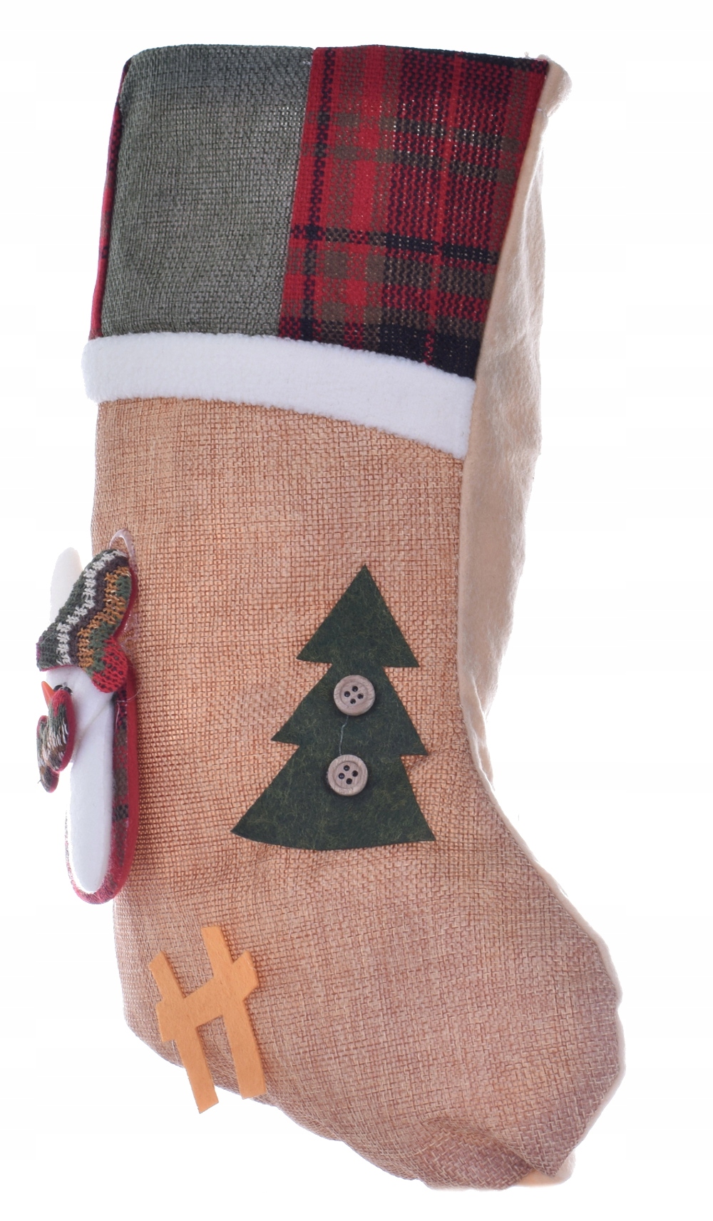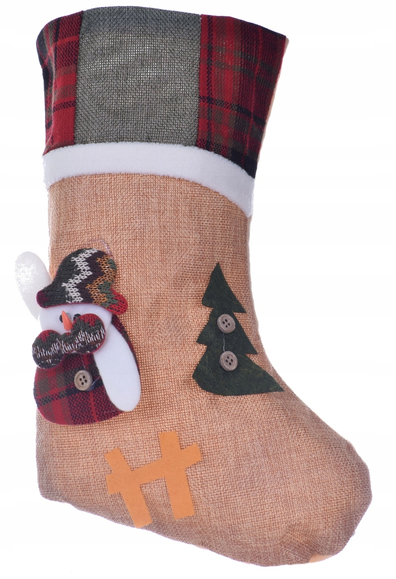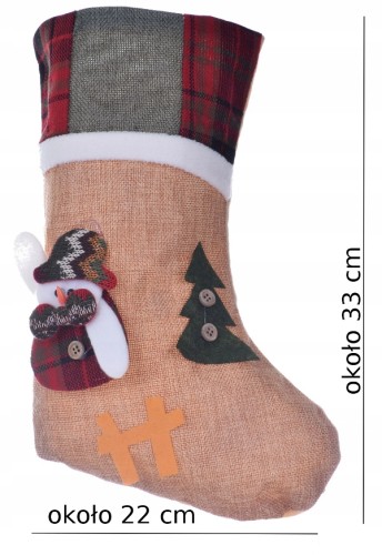 - skarpeta mikołaja; 1szt, o wymiarach; 33 x 22 cm z naszywką choinki i bałwana