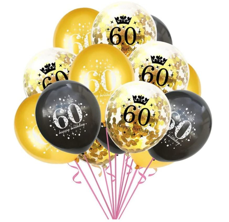 Zestaw balonów dekoracyjnych na 60 urodziny. Rewelacyjnie sprawdzi się również jako element dekoracji.